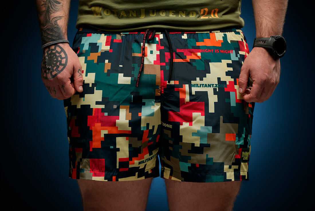 Uniform of the new order: swimshorts for both battle and leisure. Pixelated chaos on the fabric refers to the digital age — an era of war for Identity and Will.