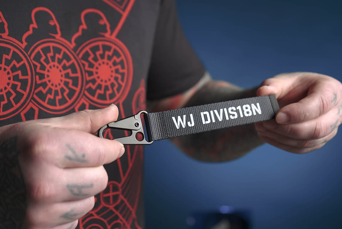 Key holder in strong nylon-polyester tape WJ DIVISION lettering. Black metal carabiner on the other end.